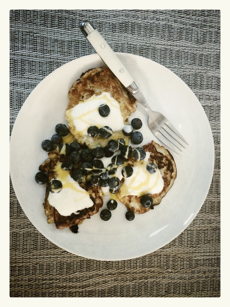 Mix and pour onto hot, buttered griddle. So much better than my usual hard boiled egg and a banana breakfast! I top mine with plain yogurt, blueberries, and Barlean’s Total Omega Swirl 3-6-9 Supplement