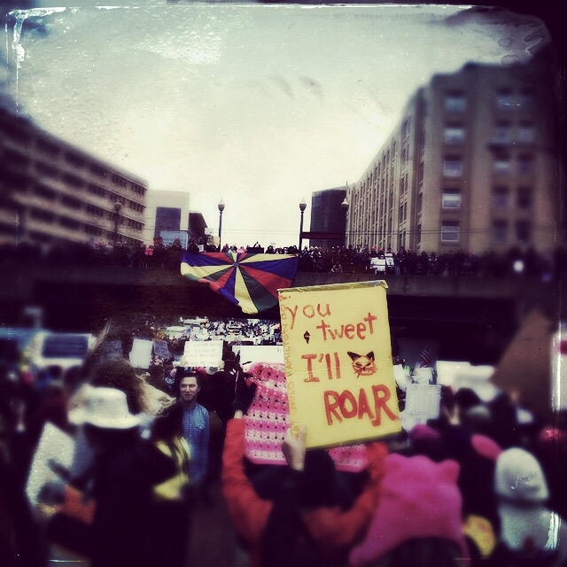 Make it fun, somehow. Four years is a long time and if resisting starts to feel like drudgery, it won’t sustain. Find a community, create beauty and use humor, take breaks, and use the slow and steady approach. The signs at the women’s march were amazing, clever, and funny. Hundreds of thousands of people sat at their kitchen tables in the days leading up to the march with glue, markers, and paper and created signs which are now being sent to museums around the world. Many thousands of others sat in yarn shops knitting pink pussy hats. Use your hands to ground you.