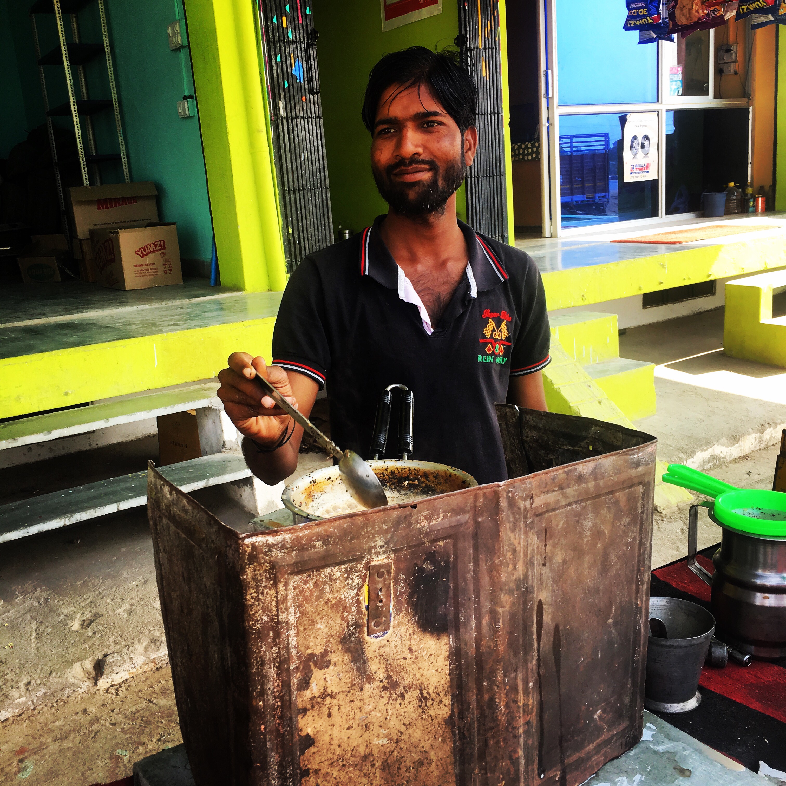 I have a sore throat after leaving Jaipur and he pulls off at a chai stand and asks them to add extra ginger to my chai.