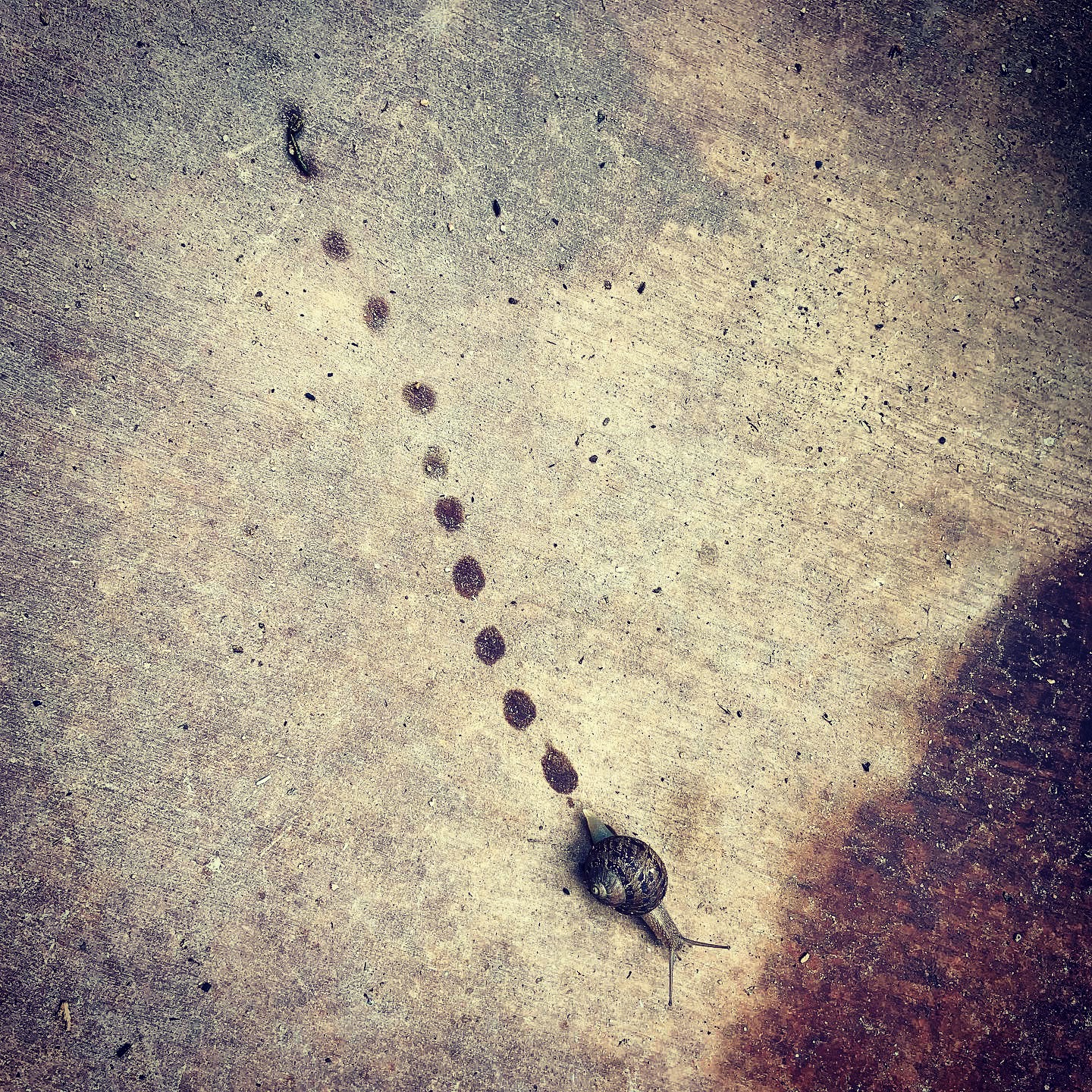 Yesterday, a snail inches his way across my porch. A trail of dots in its wake. Slow and steady. Keep going, little dude.
