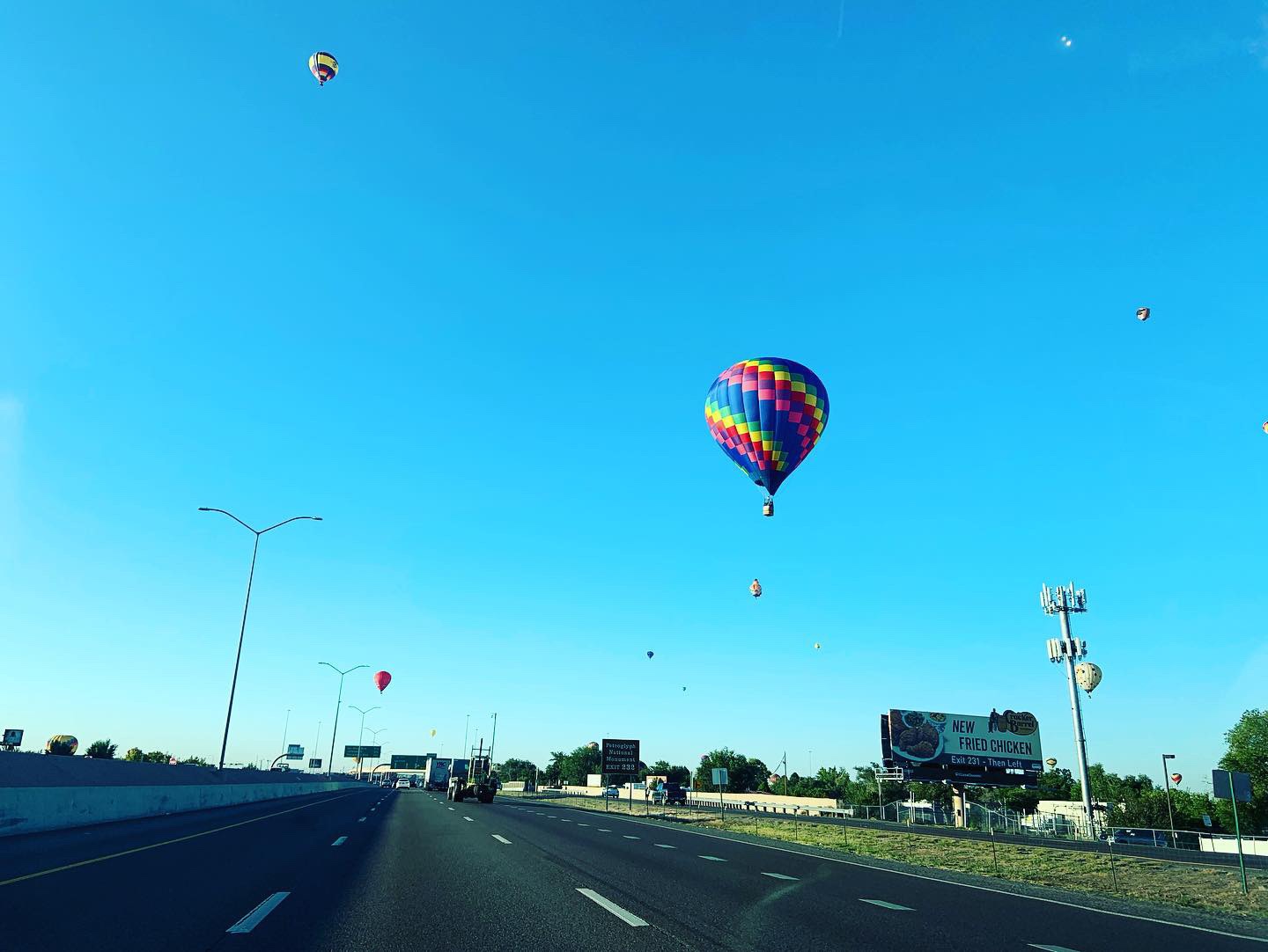 Towards the Shell station he blows. Up and over the Frontage Road, the Target parking lot, and then, the thing he’s been warned about all along… the freeway. Cars swerve below as distracted motorists attempt photos while driving.