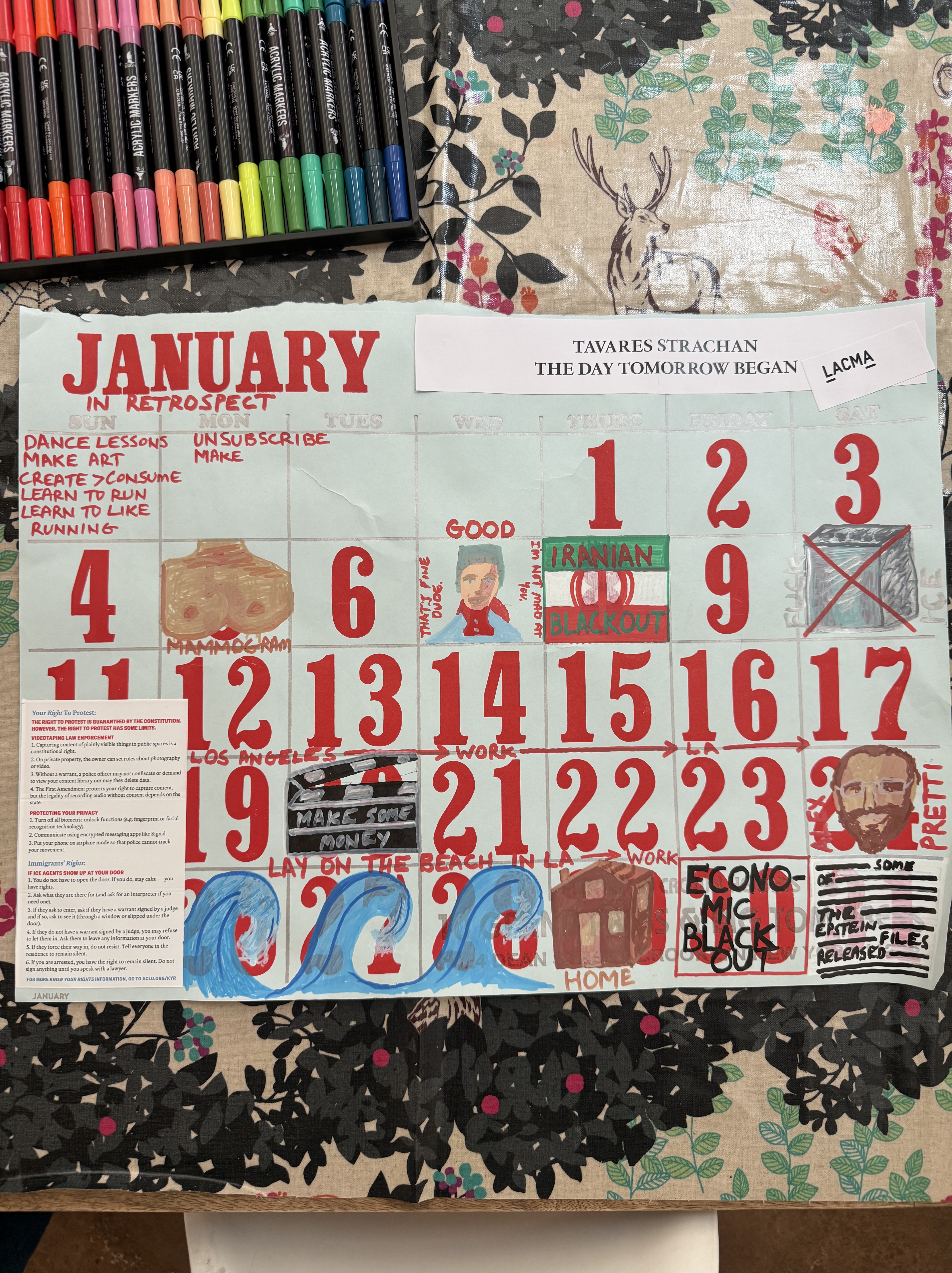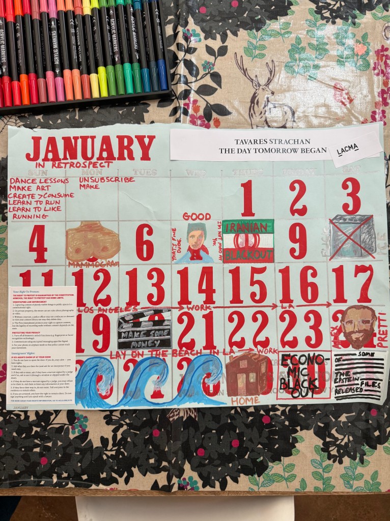 Every year I get a beautifully hand printed calendar from 10 Grand Press (10grandpress.com) and for years have used the discarded pages to wrap presents, make cards, and cover books. This year as I ripped off January’s page, I thought of all that had happened in 31 days; New Years resolutions begun, one doctor’s appointment, one work trip to Los Angeles, hundreds of protests against ICE, multiple corporate boycotts, two murdered Americans, hundreds of detained children, thousands of kidnapped people, 31 dinners, 31 breakfasts, 31 sleeps, one walk on the beach, two amazing museum exhibits in LA (Monuments at MOCA and Tavares Strachan’s The Day Tomorrow Began at LACMA), a few visits with friends, a bunch of walks with my boyfriend and my dog, and all the other stuff that makes up life, not to be taken for granted but often forgotten. That was just January, I thought. Whoa.