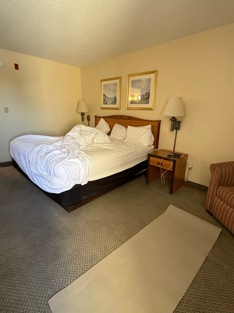 When I add it up, I have lived in hotels for years of my life. There have been shitty ones, like the one with the ripped shower curtain and the rotary phone on the wall next to the toilet in Las Vegas, NM, and beautiful ones like the one in Spetstis, Greece, steps from the sea. I have a little hotel room kit I always pack; yoga mat, coffee mug, utensils, lavender spray air freshener, flip flops.
